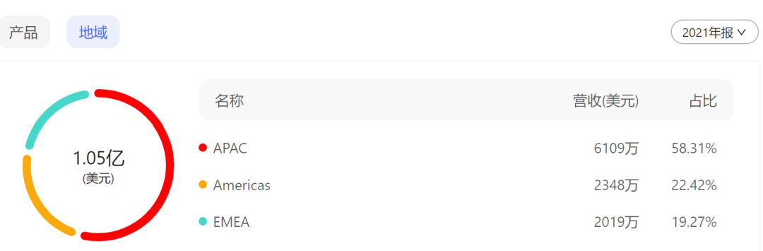 2021年,从地域方面来看,Codexis公司的业务主要在三个划分区域开展:APAC(指澳大利亚,新西兰,东南亚以及中国);美洲(美国,加拿大和拉丁美洲);EMEA(欧洲,中东和非洲)。其中APAC地区营收数额最高,为6109万美元,占总营收的58.31%;其次是美洲地区,营收2348万美元,占比22.42%;排名第三的是EMEA地区,营收2019万美元,占比19.27%。