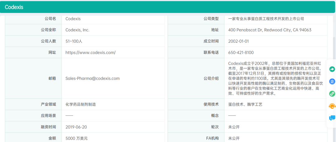 据药融圈旗下,药融云数据(https://www.pharnexcloud.com/?zmt-mhwz)资料,Codexis.Inc(纳斯达克股票代码:CDXS)成立于2002年(从Maxygen公司分拆而来),总部位于美国加利福尼亚州红木市。2010年,Codexis在纳斯达克上市。
