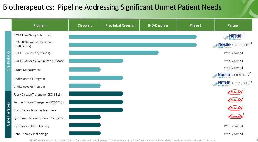 2020年3月,Codexis与Takeda签订了Takeda协议,根据该协议,Codexis将合作研究和开发用于基因治疗的蛋白质序列。根据法布里病、庞贝病和一种未披露的凝血因子缺乏症的相应项目计划,为某些疾病适应症提供候选治疗方法。包括提供给Takeda的CDX-6311。