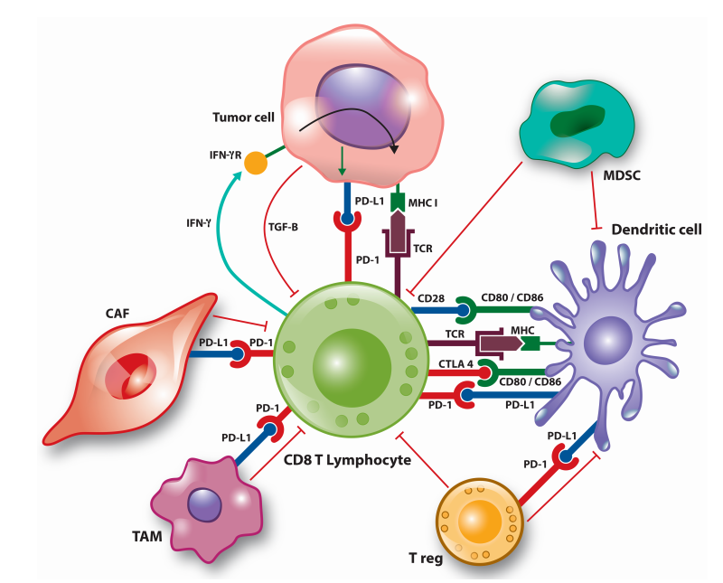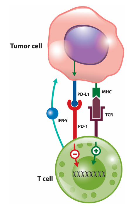 PD-L1的表达是动态的,在肿瘤类型、肿瘤部位,甚至在同一肿瘤标本中表现出显著差异。肿瘤细胞中PD-L1的表达受基因组、表观遗传学和转录机制的调控。肿瘤细胞上的PD-L1与NSCLC中CD8+T细胞浸润程度之间的强相关性很可能是由于对炎症信号(如IFN-γ)反应中的转录调节,这些炎症信号是由活跃的抗肿瘤免疫反应产生的。