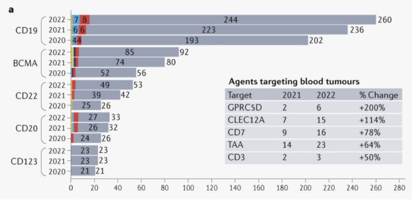 与2021年一样,在血液系统恶性肿瘤中,CD19,BCMA和CD22仍然是最受青睐的的靶向蛋白。GPRC5D(+200%),CLEC12A(+114%)和CD7(+78%)等靶点的研发数量也急剧增长。