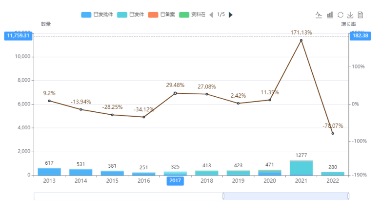 据药融云中国药品审评数据库显示,中药产品 2021 年承办数量达到峰值,增长率达到171.13%。