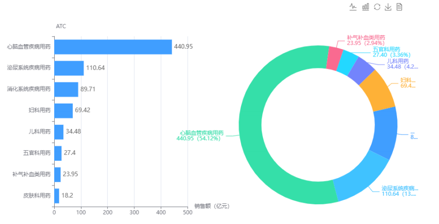 据药融云数据库显示,2020年心脑血管病用药、泌尿系统疾病用药及消化系统疾病用药等 3 个品类的中成药在医院市场销售较大。其中心脑血管疾病用中成药更是达到 440 亿元的市场规模。