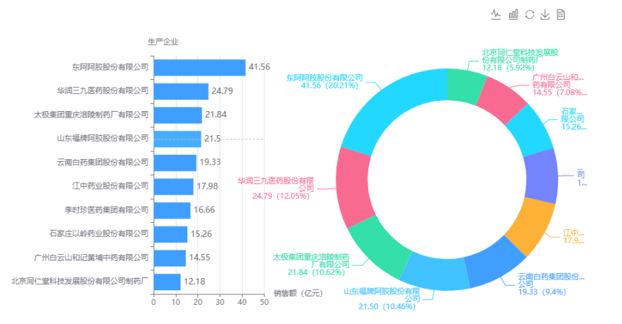我们看到,东阿阿胶排在首位,山东福牌阿胶排在第四位,两个企业的销售额加起来为 62.9 亿元,而阿胶的销售额为 64.23 亿元,绝大部分市场份额由这两个大企业贡献。