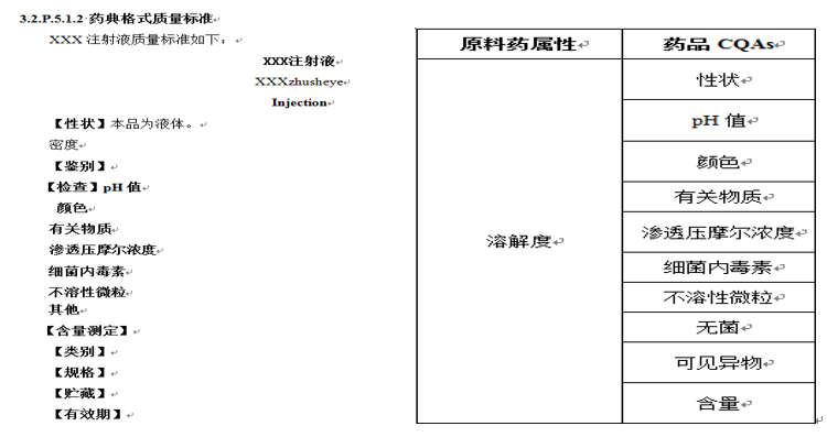 以一个ANDA的M4模块3的3.2.P.2为例,本部分为产品开发,期间涉及QTPP要素、CQAs、原料对制剂的风险评估等表格的撰写,以上几个表格中均需要分析具体的检验项目,检验项目的撰写顺序一般参照3.2.P.5中的质量标准中的顺序,整套资料涉及CQAs保持顺序的一致性,也会赢得一定的印象加分,以下图为例: