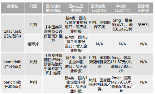 目前国内已获批的JAK抑制剂仅3款,分别为托法替布、芦可替尼、巴瑞替尼,均为第一代JAK抑制剂。其中托法替布片剂除原研进口产品外,另有15家国产企业的仿制产品获批,且有较多企业按新4类进行注册申报。芦可替尼、巴瑞替尼目前国内暂无仿制药,也暂无企业注册申报。