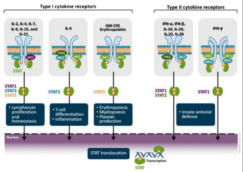 JAKs属于酪氨酸激酶家族,共有4个成员:JAK1、JAK2、JAK3、TYK2。其中JAK1、JAK3更多负责免疫调节,而JAK2主要与红细胞和血小板的生成相关。转录因子 STAT 家族共发现 7 个成 员,即 STAT1、STAT2、STAT3、STAT4、STAT5A、STAT5B和STAT6。
