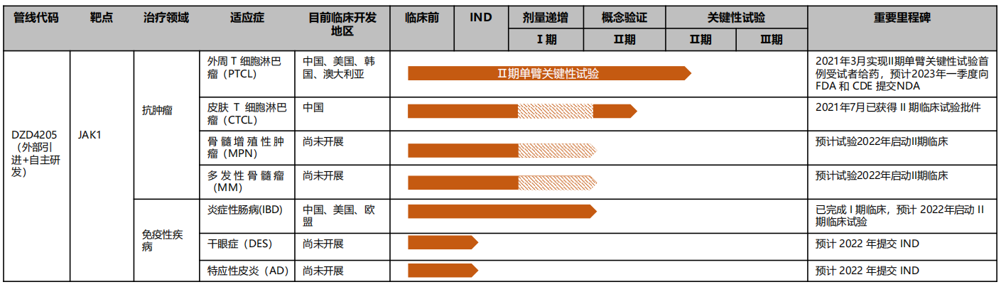 目前迪哲医药已启动针对复发难治性外周T细胞淋巴瘤(PTCL)的国际多中心II 期单臂关键性临床试验,预计于2023 年季度可分别在美国 FDA 和中国NMPA 等全球主要国家和地区提交上市申请。 截至 2020 年 12 月 7 日的 I/II期临床试验数据显示 DZD4205 在 II 期推荐剂量(150 mg)水平的 ORR( 客观缓解率)达到51.9%,且安全性良 好。2020年9月,美国 FDA 授予DZD4205 用于治疗 T 细胞淋巴瘤(treatment of Tcell lymphoma)的孤儿药资格认定。