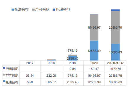 从市场表现来看,国内JAK抑制剂自2017年首个产品获批以来市场规模快速增长,2020年达到2.92亿元,而2021仅Q1、Q2就已反超2021全年。