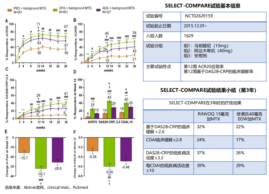 SELECT-COMPARE 为一项多中心、随机、双盲的Ⅲ期临床试验,旨在评估、比较RINVQ(乌帕替尼)与安慰剂/HUMIA(阿达木单抗)用于对甲氨蝶呤(MTX)应答不足的中重度类风湿性关节炎成人患者的有效性、安全性。此 前,艾伯维已经公布,在接受治疗12周后,3期临床试验SELECT-COMPARE结果表明,Rinvoq达到了ACR20应答和临床缓解的主要终点。