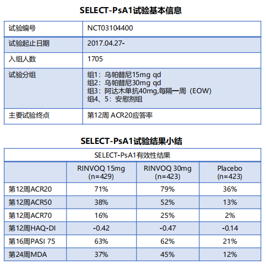 SELECT-PsA1研究在281个中心进行,共纳入对非生物类DMARDs应答不佳或不耐受的PsA患者1704例。患者分别接受乌帕替尼(15mg/d)、乌帕替尼(30mg/d)、阿达木单抗(皮下注射,每隔一周40mg)或安慰剂治疗。