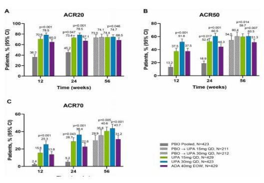 经12周治疗后,15mg/d乌帕替尼组ACR20应答率为70.6%;30mg/d乌帕替尼组为78.5%;阿达木单抗组为65%;安慰剂组为36.2%。两种剂量的乌帕替尼均显示出不低于阿达木单抗的ACR20应答率。