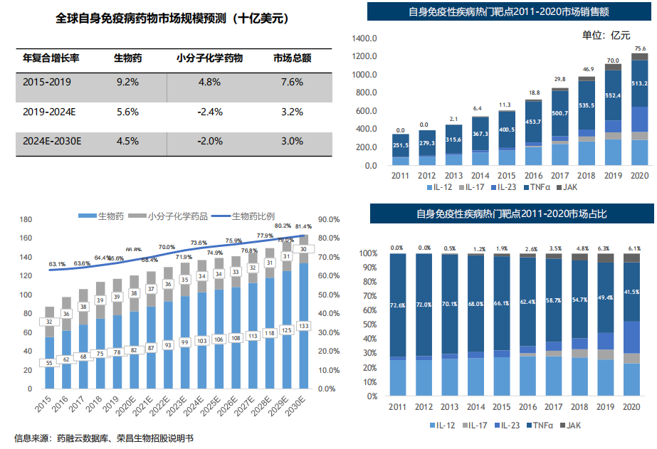 近年来,自身免疫性疾病已经成为除心血管疾病和癌症外第三大慢性病,其患病人数不断上升,市场规模也不断扩大。全球自身免疫病药物市场预期将由 2019 的 1169 亿美元增至 2030 年 的1638亿美元,其中生物药的市场份额预期将由2019年的66.8%增至2030年的81.4%。