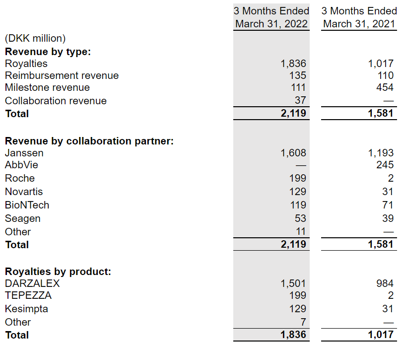 按照收入类型、合作方、产品划分,Genmab在2022年第一季度的收入分布情况如下: