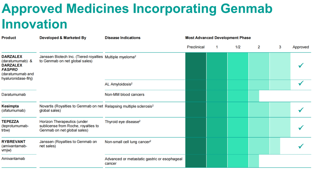 2、利用了Genmab技术和创新引擎,由合作伙伴主导开发和商业化的合作产品(Partnered Products)。