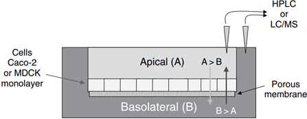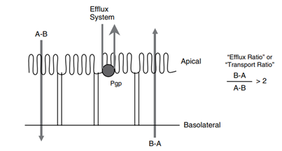 图2 Cell layer efflux assays measure the permeability both the apical to basolateral (A-B) and basolateral to apical (B-A) directions and calculate an efflux or transport ratio. A ratio >2 indicates efflux. (来源于参考文献2)