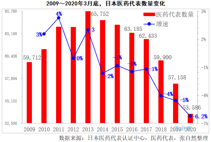 2009年时,日本医药代表总数已接近6万人,为59712人,此后逐年增加,到2013年,超过6万人,达到了65752人的峰值。此后又逐年下降,2018年已跌破6万人大关,为59900人,到2020年3月底已下降到53586人,比上年又减少了3572人。