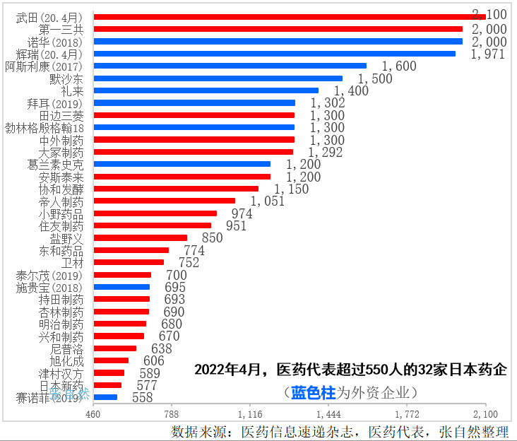 截至2022年4月底,在日本,拥有550人以上医药代表的药企共有32家。