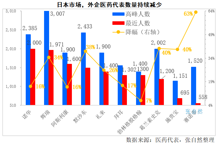 外企医药代表居多,在日本医药市场举足轻重。但近年来下滑明显。