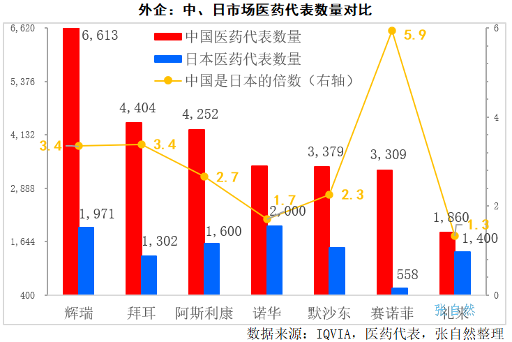 阿斯利康、诺华、默沙东在我国的医药代表数量分别为4252个、3398个和3379个,分别是是日本市场1600个、2000个和1500个的2.7倍、1.7倍和2.3倍。
