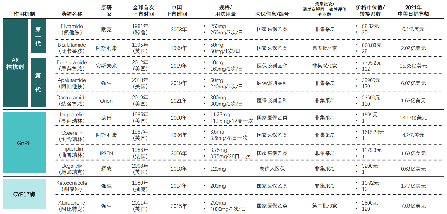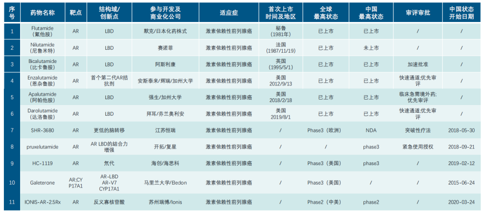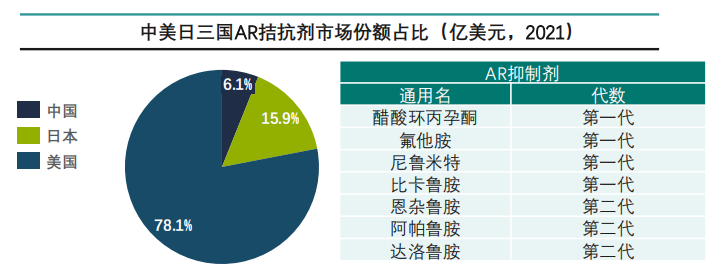 第一代AR拮抗剂包括:环丙孕酮(甾体类)、氟他胺、尼鲁米特、比卡鲁胺(非甾体类)等,第二代AR拮抗剂包括恩杂鲁胺、阿帕鲁胺、达洛鲁胺等。