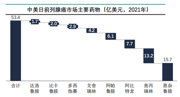 通过数据分析显示,2021年中美日三国前列腺癌用药市场规模约为53.4亿美元,其中美国33.7亿美元为全球最大市场,中国约13.4亿美元,是增速最快市场。