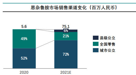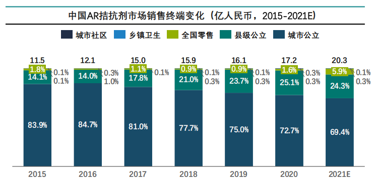 目前AR整体销售渠道依旧以公立市场为主(2021年约85%),由于目前公立医院受政策约束较强销售额持续下降,县级市场及全国零售的市场份额逐年增加。