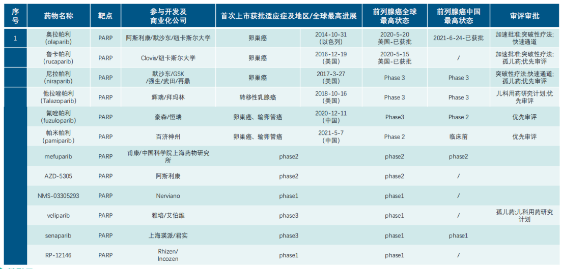 前列腺癌适应症下PARP抑制剂上市及在研药物(部分)