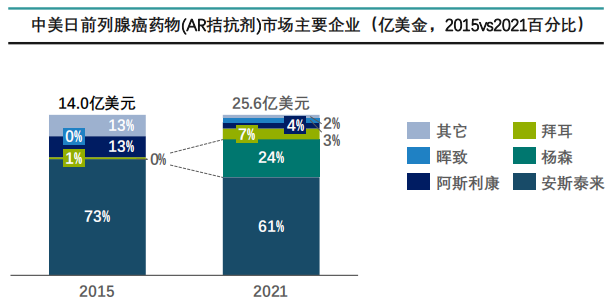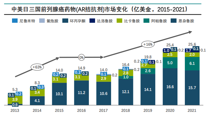 从中美日三国销售数据来看,自2015-2021年AR拮抗剂市场增长了84%,在2021年三国达到了25.6亿美元销售额,可以看出前列腺癌药物市场是一个增长快速的市场。