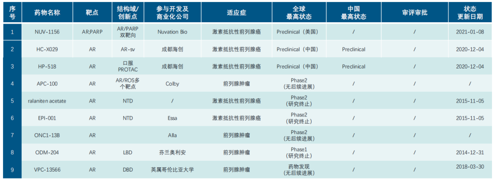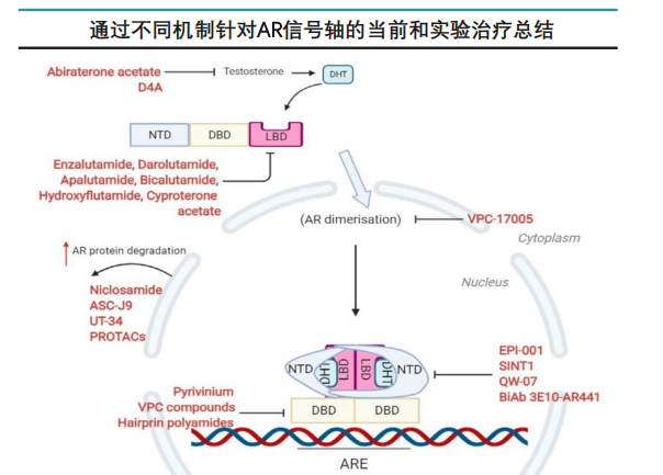 临床上使用的非甾体类雄激素受体抑制剂药物全都作用于LBD结合域,靶点过于单一,使得对前列腺癌患者的治疗存在局限性。目前新的结合域、化合物改良、AR降解剂和二聚抑制剂均有在研药物。