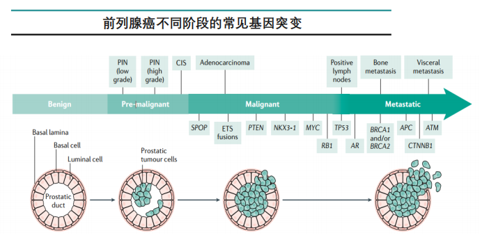 前列腺癌是一种高度异质性的疾病,患者可能同时存在一种或多种基因突变,例如TMPRSS2-ERG融合、PTEN和RB1删除、TP53突变和MYC扩增,这些都是前列腺癌各个阶段常见的基因改变。