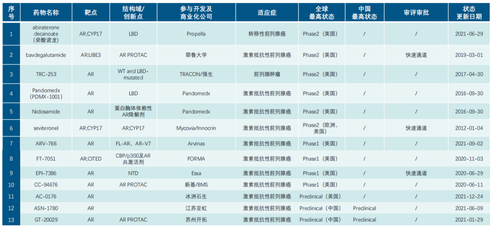 前列腺癌适应症下AR靶点上市及在研药物