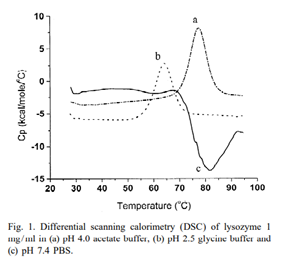 上图为1mg/ml的溶菌酶在(a) pH 4.0 醋酸盐缓冲液、(b) pH 2.5 甘氨酸缓冲液和 (c) pH 7.4 PBS的差示扫描量热法曲线。发现溶菌酶在 pH 4.0 醋酸盐和 pH 2.5 甘氨酸盐中构象稳定,具有良好的稳定性,但是在 pH7.4 磷酸盐中,溶菌酶随着温度的升高有聚合的趋势。