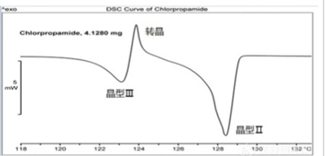 此外,差示扫描量热法(DSC)图谱还可提供其热力学变化过程,发现各晶型转变,为选择转晶条件提供依据,如从下图可以看出某药物的两种晶型的转变过程。