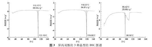 下图为3种晶型异丙双酚的差示扫描量热法(DSC)曲线图,可以看出3种晶型的差示扫描量热法(DSC)图有较大差异,可以用于区分3种晶型。