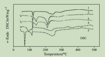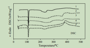 上图为卡托普利与各种辅料的1:1物理混合物的差示扫描量热法(DSC)曲线图,其中曲线1-卡托普利,2-卡托普利+CMC101 ,3-卡托普利+CMC102, 4-卡托普利+乙基纤维素,5-卡托普利+甲基纤维素。