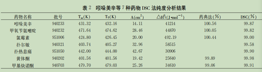 与传统的 HPLC法纯度分析相比,基于热动力学原理的差示扫描量热法(DSC)纯度分析法(依据范德霍夫方程) 利用物质的差示扫描量热法(DSC)熔融曲线,计算该物质的杂质含量,没有繁琐的样品前处理过程,也无需寻找适宜的标准物质、溶剂,该方法简便、快速,更适合高纯度物质分析,所需样品量少,因此适用于化学药品对照品的纯度研究。下表为7种药物通过差示扫描量热法(DSC)及其纯度测试软件得到的纯度结果。