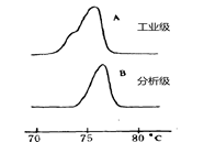 因为物质的熔融行为受杂质的影响,多数有机物会发生低共熔,其中杂质含量越多,熔点越低,熔程越宽。正如下图所示,某分析级药物的熔融峰较工业级该药物的峰形尖锐。