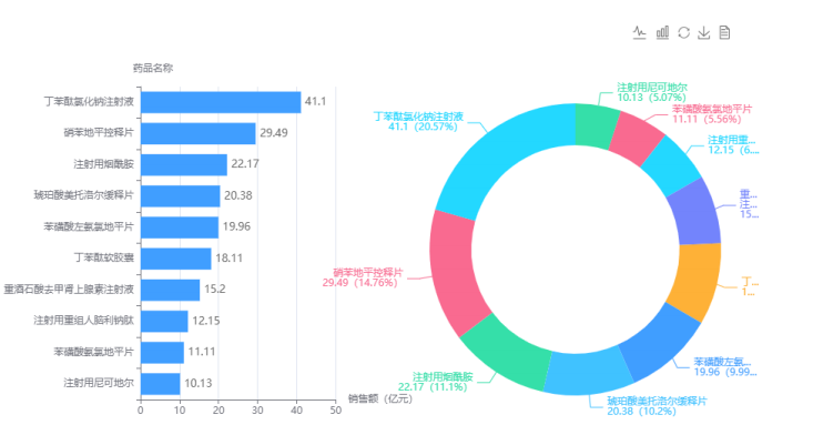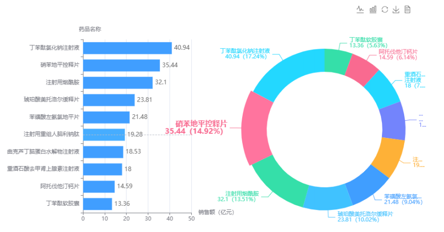 对心血管病药物医院销售数据进行全局分析,可以看到这两年心血管病用药的竞争格局变化不大。丁苯酞氯化钠注射液、硝苯地平控释片、注射用烟酰胺依然占据榜单前三甲。