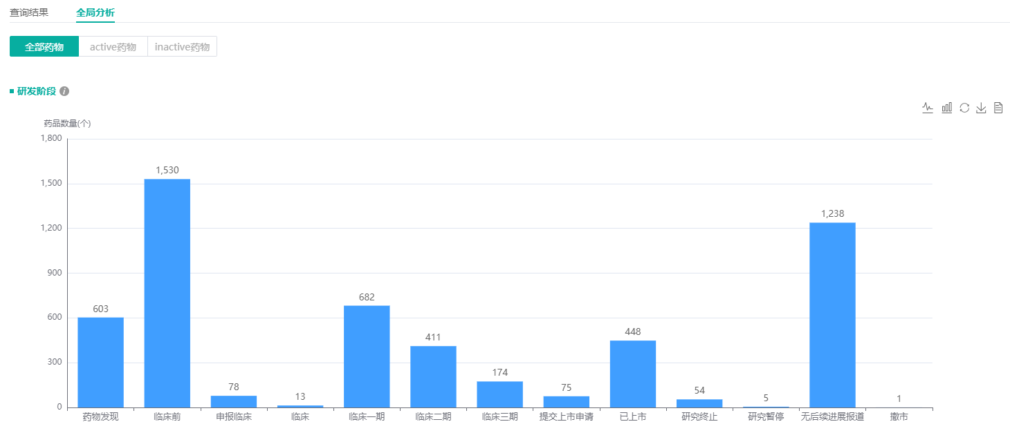 据药融云全球药物研发最新数据显示,全球化学药药物发现药品数量为3731个,临床前的药品数量达到8035个;其中,国内化学药药物发现药品数量为603个,临床前药品数量达到1530个。