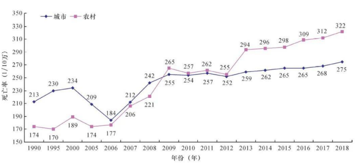 1990-2018年中国城乡居民心血管病死亡率变化