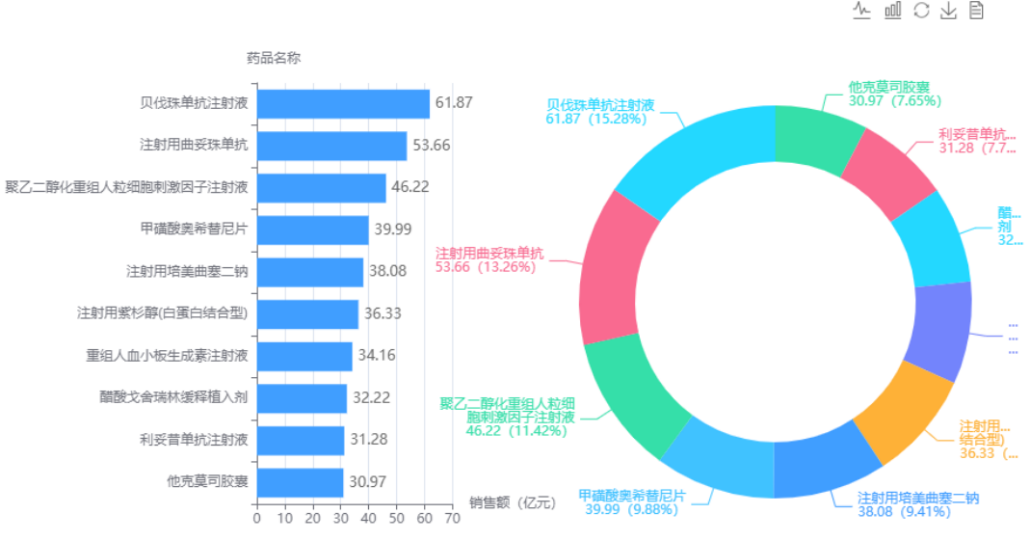 据药融云全国医院销售数据显示,在2021年Q1-Q3医院市场中,贝伐珠单抗是肿瘤用药中的佼佼者,曲妥珠单抗排在第二位。医院市场竞争格局变化较大,贝伐珠单抗在2020年还排在第7位。