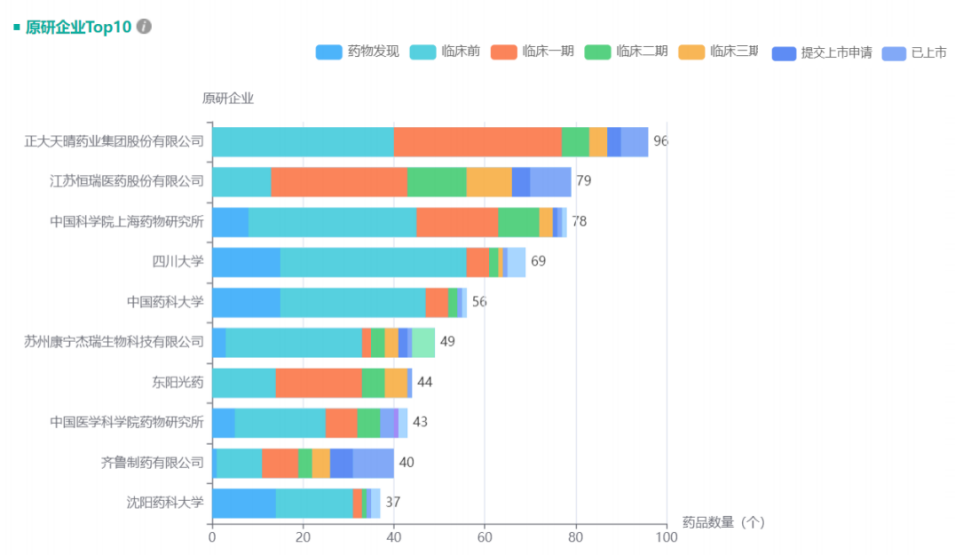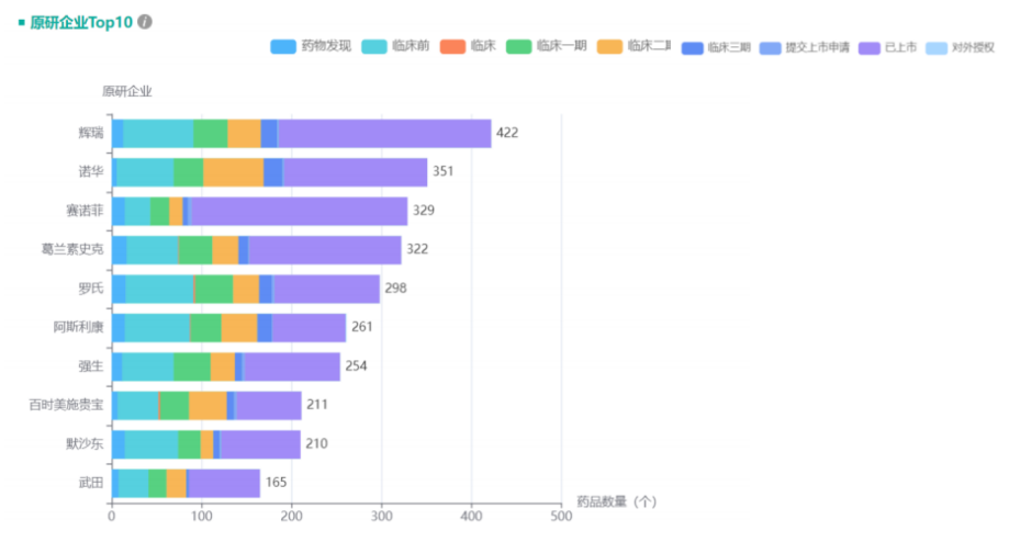 比如通过全球药物研发数据可以看到,目前全球新药品种排名Top10企业,上市品种占比大;而国内企业新药品种主要集中在研发阶段,上市的新药品种占比非常小。