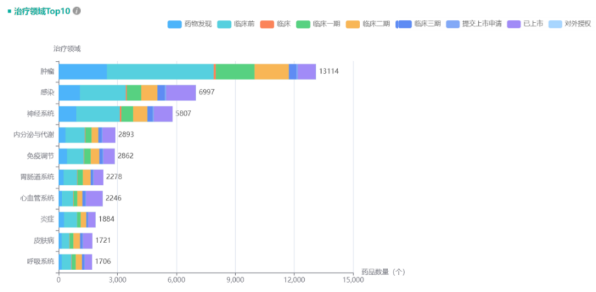 国内科研院校的转化能力较强的机构主要有中国科学院上海药物研究所、四川大学、中国药科大学、中国医学科学院药物研究所和沈阳药科大学等。以及目前国内外的热门研究领域,都主要集中在肿瘤领域。