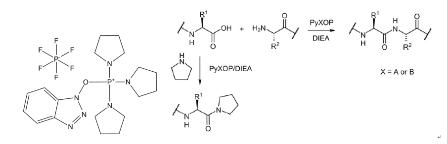 磷盐型缩合剂,常用PyBop,PyAop配合三级胺一起使用。高效活化体系,一般情况下第一次偶联反应不完全的情况下可以考虑使用PyXop/DIPEA缩合体系。比起HXTU/DIPEA,这个偶联剂不会引起类似的氨基封端反应,因此在固相合成中更加受欢迎。但是质量差的或存放时间长的PyXop中吡咯的含量会增加,活化时会使氨基酸羧基封端生成吡咯酰胺,失去反应活性。机理见图e