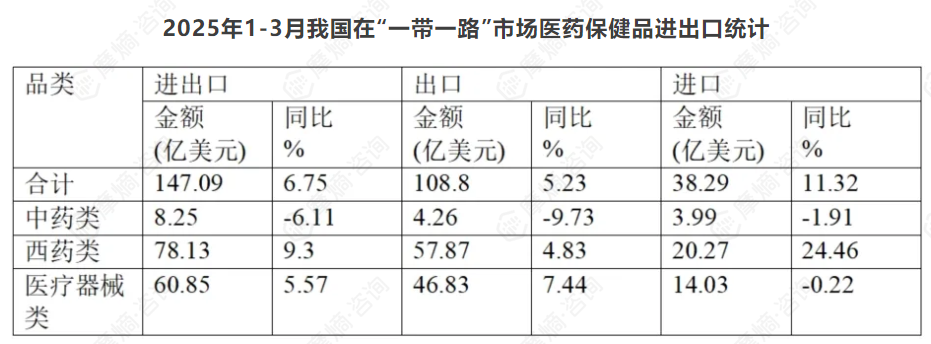 2025年一季度,中国医药保健品进出口总额达到470.88亿美元,同比微增0.38%。其中,出口额为266.32亿美元,同比增长4.39%,主要依赖西药原料、医疗器械耗材等传统优势产品的持续增长;进口额延续收缩态势,同比下降4.42%至204.56亿美元,反映国内产业升级带来的进口替代效应。