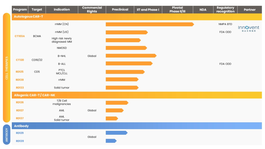 - 2022年6月2日,驯鹿生物与信达生物共同宣布NMPA正式受理由双方合作开发的伊基仑赛注射液(驯鹿生物研发代号:CT103A;信达生物研发代号:IBI326)治疗复发/难治性多发性骨髓瘤(R/R MM)的上市许可申请(NDA)。伊基仑赛注射液是国内第一款全流程自主研发的CAR-T细胞治疗产品,是国内首家递交新药上市获受理并有望成为国内首款获批的靶向BCMA的自体嵌合抗原受体T细胞免疫治疗产品。