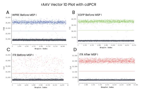 A图显示WPRE检测的1D散点图,B图显示GOI检测的1D散点图,C图显示Msp I酶切处理前ITR检测的1D散点图,D图显示Msp I酶切处理后ITR检测的1D散点图,蓝色表示WPRE阳性微滴群,绿色表示EGFP阳性微滴群,红色表示ITR阳性微滴群,灰色表示阴性微滴群。当WPRE或GOI比ITR越接近1:2,则产品的基因组更完整。