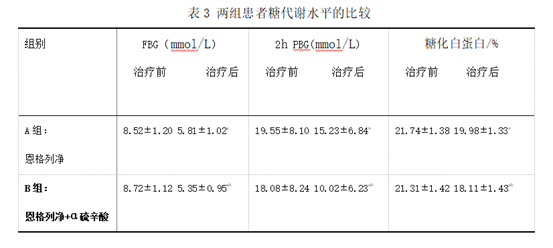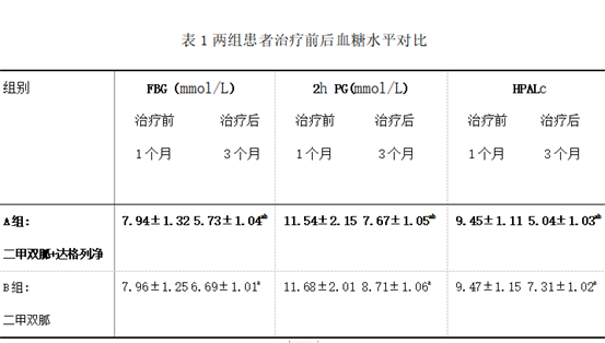 根据两组患者治疗前后血糖水平对比治疗。前1个月,两组患者FBG、2hPG、HbA1c 水平对比,无明显治疗差异;治疗后3个月,两组患者FBG、2hPG、HbA1c 水平均优于本组治疗前,且A组优于B组[5]。