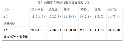 根据临床疗效分析,两组患者均实施常规治疗,包括抗凝、降脂、神经修复等常规药物治疗。其中A组给予恩格列净25 mg,早餐前口服,1次/天,疗程6周。B组在A组基础上加用α- 硫辛酸 100 mg,早餐前口服,2片/次,1次/天疗程6周。